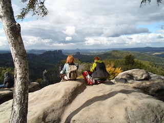 Die Ferienwohnung verfügt über einen großen teilüberdachten Balkon (für Raucher bestens geeignet) mit einem wunderschönen Blick auf den Falkenstein und die Schrammsteine.
