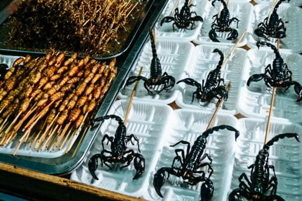 Skorpione gehören in manchen Gegenden Chinas zu einer gut sortierten Imbiss-Meile, so wie bei uns Fritten und Bratwurst. Auch in Thailand kannst du Skorpion im Restaurant bestellen, sowohl frittiert als auch gekocht. Bis auf den Stachel ist er komplett genießbar, wobei die Schale entfernt werden muss. Geschmacklich erinnert er an Hummer.