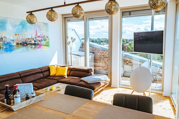 Eine moderne Ausstattung und eine riesige Terrasse, die sich komplett um das Wohnzimmer zieht: Die Ferienwohnung „Penthouse am Meer Barth“ hat einige Highlights für deinen Urlaub an der Ostsee zu bieten. Die 61 Quadratmeter große Wohnung liegt direkt am Hafen von Barth in der Region Fischland-Darß-Zingst und bietet von der XXL-Terrasse aus einen herrlichen Blick auf den Hafen und das Meer. Besonders praktisch: Die Innenstadt ist nur wenige Gehminuten von der Ferienwohnung entfernt, sodass einem gemütlichen Einkaufsbummel oder einem entspannten Café-Besuch nichts im Wege steht. Auch zahlreiche Restaurants und Bars sind fußläufig zu erreichen.