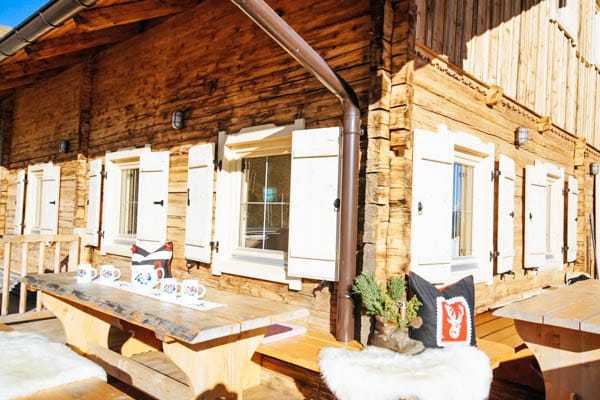 Terrasse und Blick in die Sauna der Berghütte Zirben-Heustadel