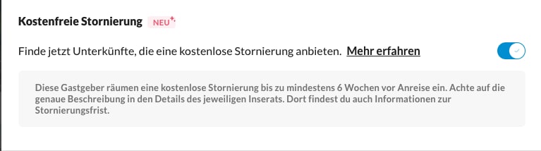 Der Zeitraum, in dem eine kostenlose Stornierung möglich ist, wird vom jeweiligen Gastgeber festgelegt. Wie bisher auch, ist der Gastgeber dein Vertragspartner und somit dein erster Ansprechpartner für die Buchungs- und Stornierungsbedingungen der gewünschten Ferienunterkunft.