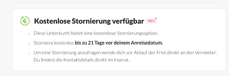 Welche Stornierungsbedingungen für deine gewählte Unterkunft gelten, findest du direkt im Inserat. Ob eine Ferienunterkunft die neue Filteroption “Kostenlose Stornierung” anbietet, erkennst du an den Hinweisen im Exposé. Diese findest du zum Beispiel neben dem Preis sowie im Punkt “Stornierungsbedingungen” der Unterkunft.