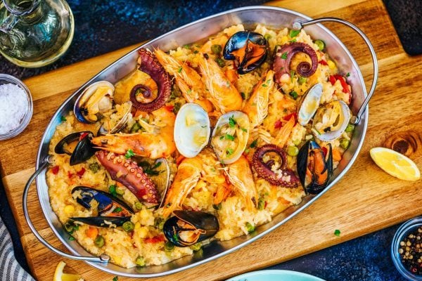Weit über die Grenzen von Spanien bekannt, ist das Nationalgericht des lebensfrohen Landes: Paella! Die Grundzutaten Reis, Safran und gutes Olivenöl bilden die Basis einer aromatischen Paella. Anschließend sind der Kreativität keine Grenzen gesetzt: Nach Lust und Laune kannst du die Zutaten variieren. Klassisch wird sie mit Hühnchen und Meeresfrüchten zubereitet, aber auch für Vegetarier gibt es leckere Abwandlungen. Wir haben für dich eine klassische Variante herausgesucht, die du einfach nachkochen kannst.